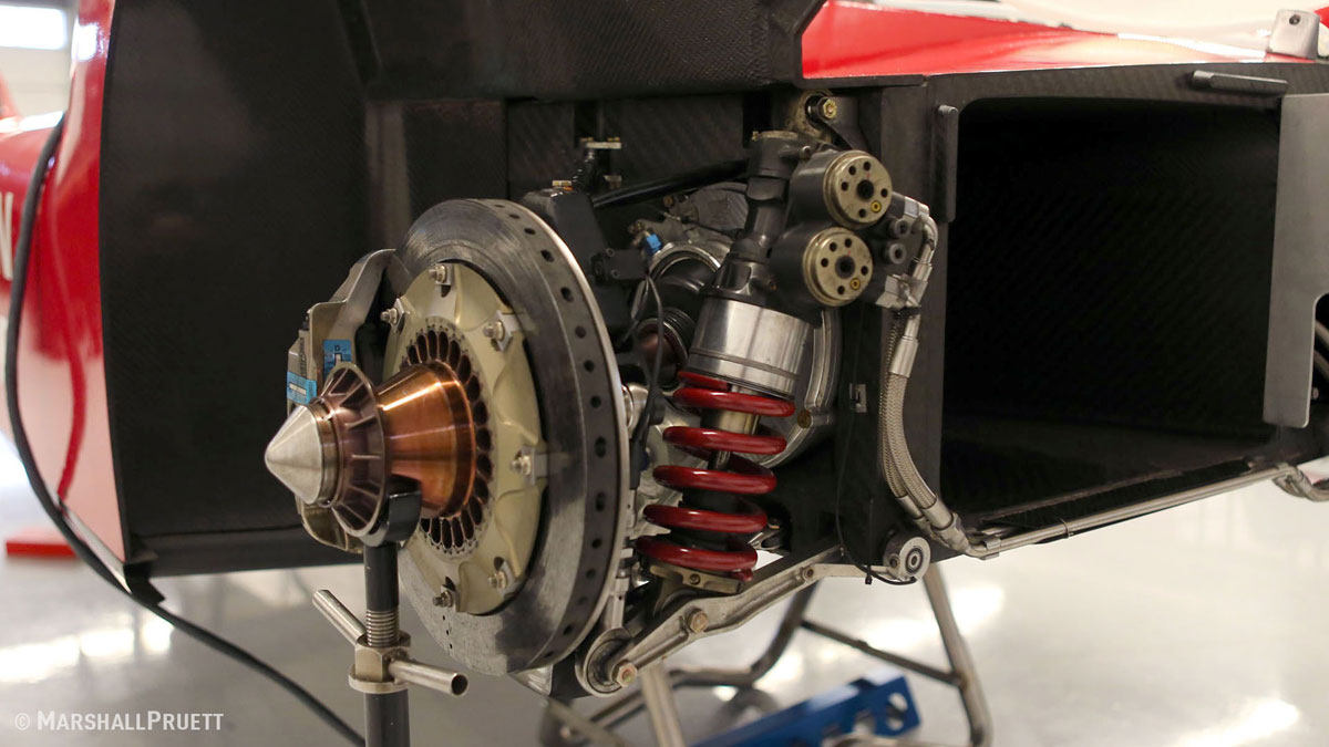 底盤系統部分,前懸吊設計與Formula方程式賽車上常見的Push Rod推桿式結構相似,避震器則配置Ohlins可多向調整的減震統與彈簧,並且配置前對向六活塞、後對向四活塞配置,碟盤則屬於Reinforced Carbon-Carbon碳纖維競技強化部品,為提高制動精準性,駕駛艙也配置可適當調配前/後煞車力道比例的煞車分配器,至於輪圈則採用BBS鍛造鎂合金材質的單孔式樣,搭配Michelin前:31/71-18、後:20/71-16的輪胎規格。